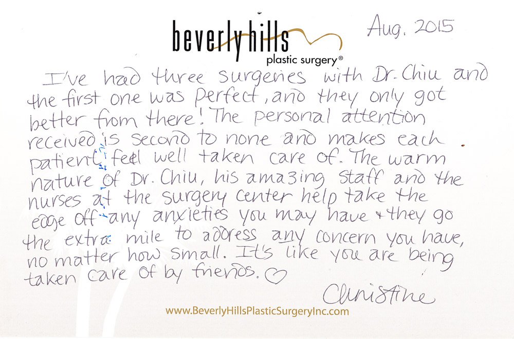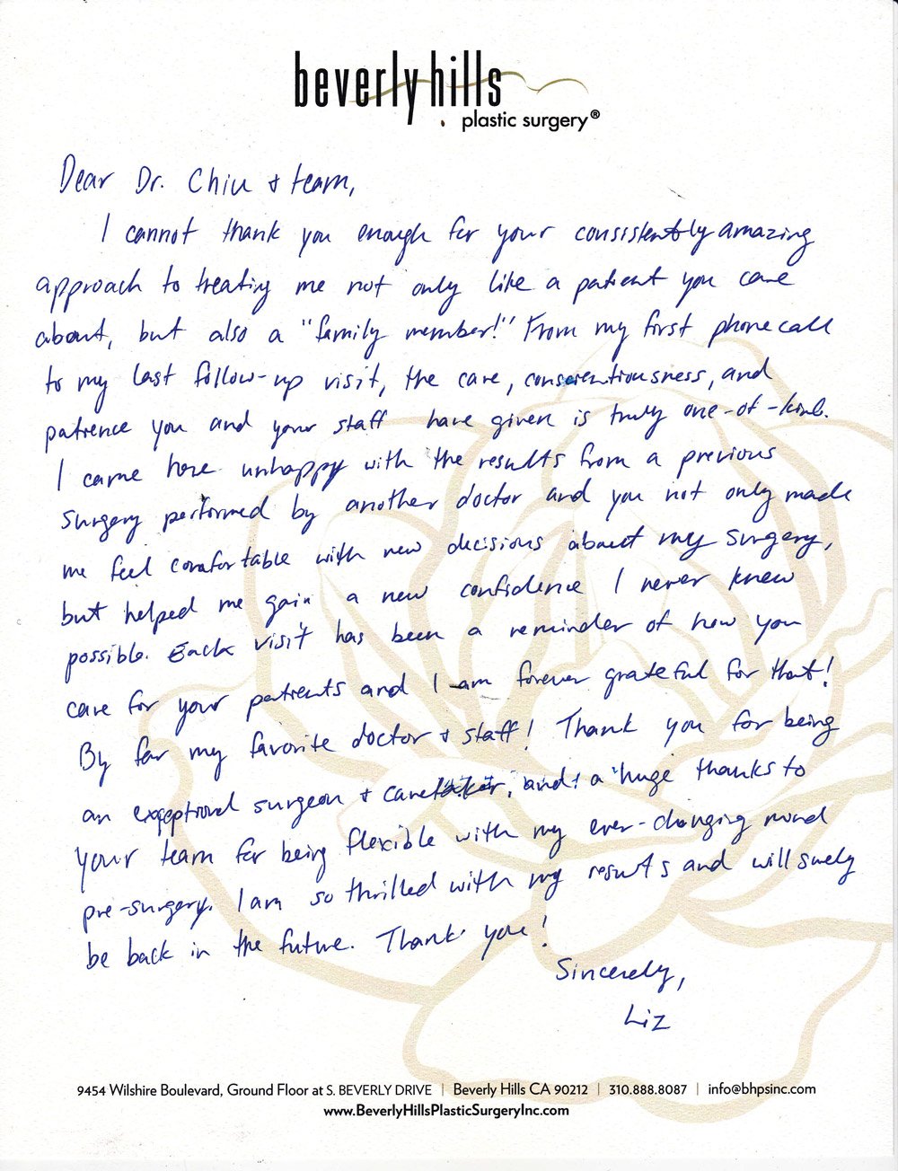 You and your entire staff are incredible. You are not only the best surgeon I have encountered but also one of the best people I know. In addition to being a phenomenal surgeon you are are kind, genuine, honest, and a wonderful listener. I highly recommend you to everyone I know.