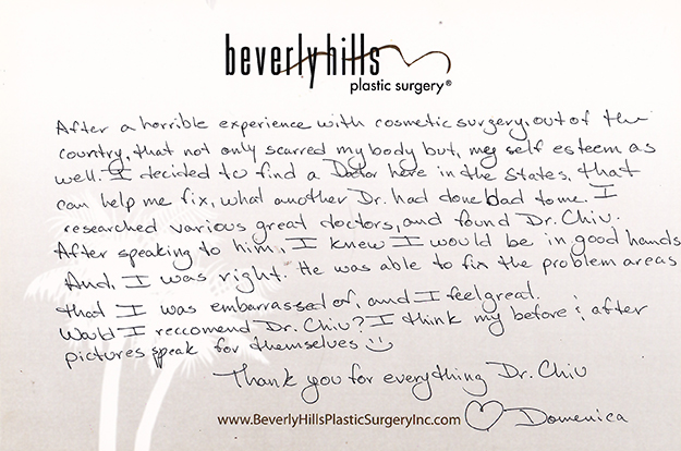 After a horrible experience with cosmetic surgery out of the country, that not only scarred my body but my self esteem as well. I decided to find a doctor here in the states, that can help me fix, what another Dr. had done bad to me. I researched various great doctors, and found Dr. Chiu. After speaking to him, I knew I would be in good hands and, I was right. He was able to fix the problem areas that I was embarrassed of, and I feel great.