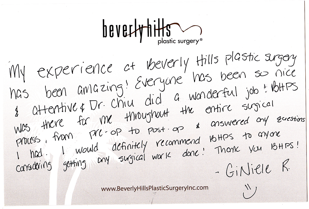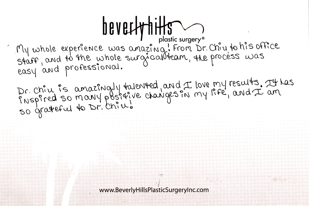All reviews are from real patients of Dr. Gabriel Chiu at Beverly Hills Plastic Surgery Inc. On behalf of Dr. Gabriel Chiu and staff at BHPS Inc, we would like to thank you for taking the time to leave us your testimonial and review. Your feedback of your experience with Dr. Gabriel Chiu and/or with the team at BHPS, Inc. is very important to us. Such comments and testimonials help us to improve upon and continue to provide the excellent service and care each patient deserves.